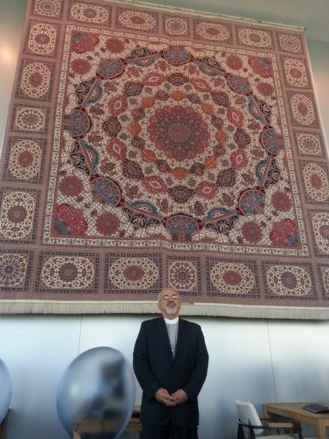 دوشنبه 8 مهر 92- در کنار فرش مزین به شعر بنی آدم در سالن مذاکرات ملل متحد. شعر جاودانه سعدی در وسط فرش با الیاف طلا نقش بسته است. این فرش را استاد صیرفیان در دوران سفارت بنده و در اواخر ریاست جمهوری جناب آقای خاتمی به سازمان ملل متحد هدیه دادند. افتخار می کنم که از این طریق آنچه سال ها در کتاب ها خوانده بودیم و هیچ جای سازمان ملل متحد اثری از آن ندیده بودیم را بالاخره به ملل متحد آوردیم.